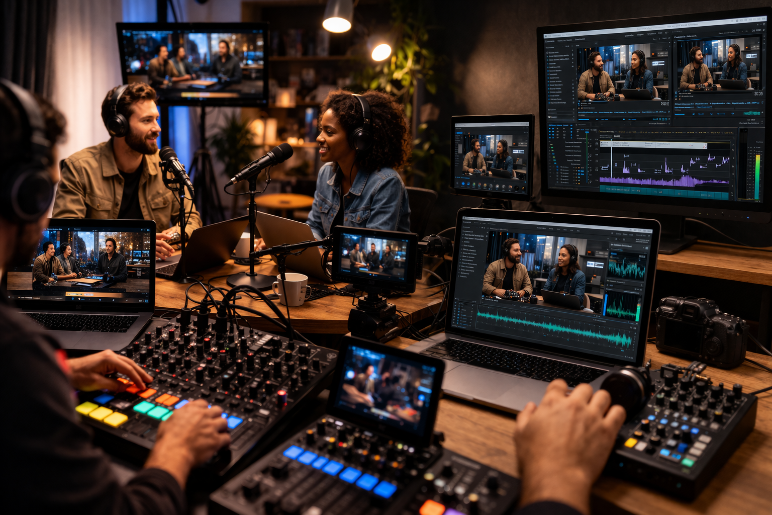 técnico incluido en la sesión monitorizando los niveles de audio y cambiando de cámara en directo.